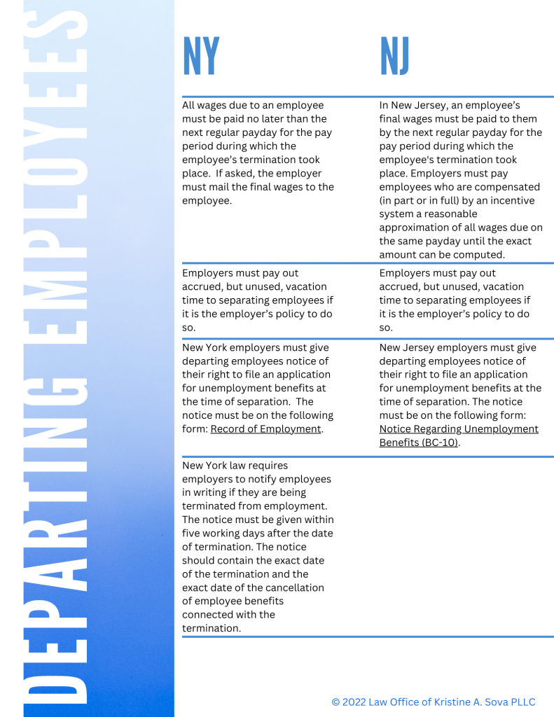 Some businesses are not aware that they must provide departing employees with certain information when the employment relationship ends. Nor are they aware that they must provide departing employees with their final paycheck within a certain time frame. Below is a one-pager that outlines those requirements under New York and New Jersey state law. A printable PDF is also available.